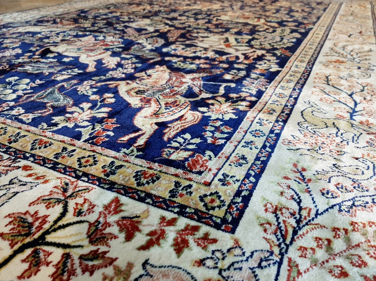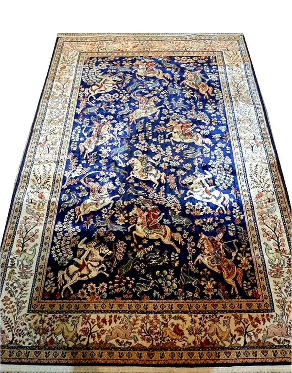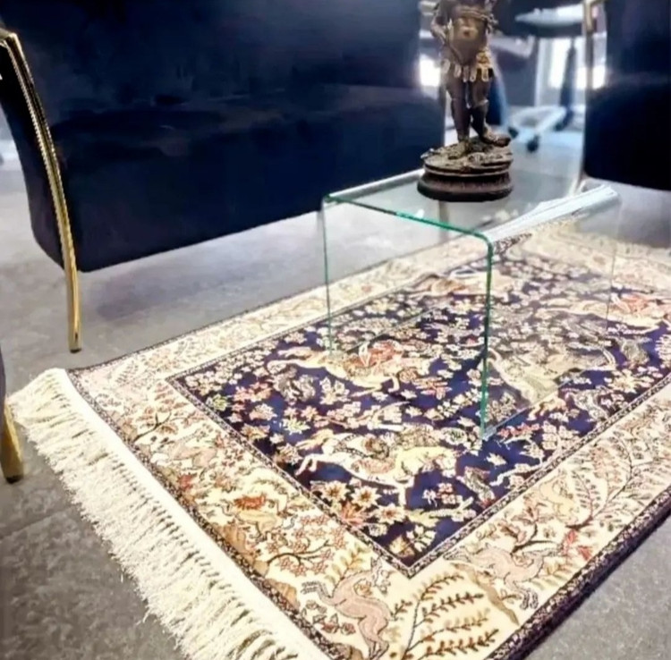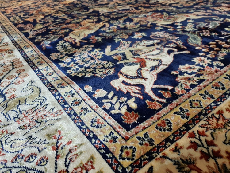 فرش ماشینی شکارگاه سرمه ای طرح دستباف ابریشم گونه